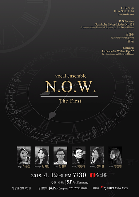 vocal ensemble N.O.W. 는 독일과 미국으로 유학을 다녀온 전문성악가 4명과 피아니스트 및 지휘자가 모여 2017년 9월에 창단된 전문 보컬앙상블 단체이다. 고음악부터 현대음악까지 장르를 넘나들며 현재 쓰여지는 음악과 이전의 음악을 현재의 시각에서 재조명하는 작업을 하려고 한다.